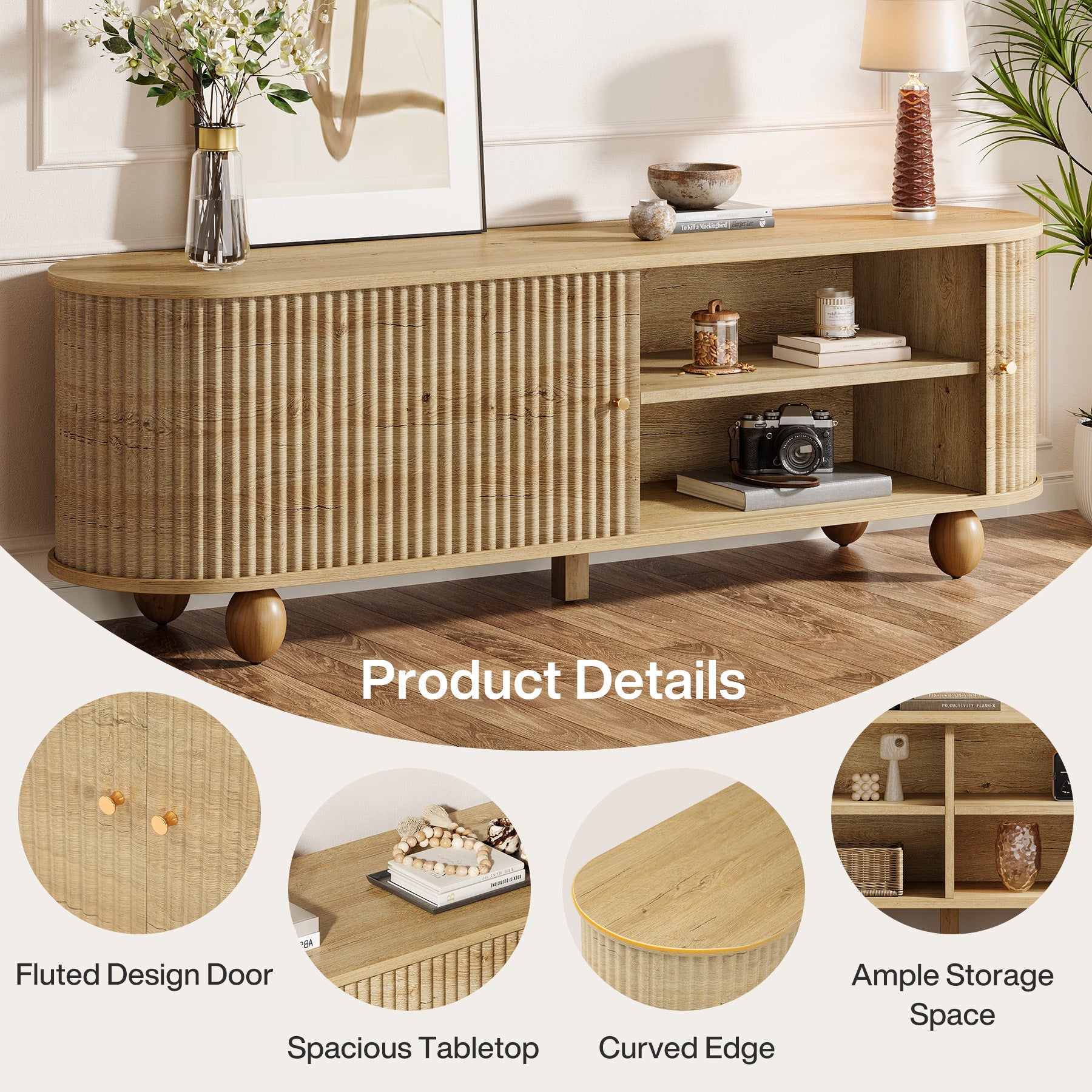 3. 70" TV Stand, Farmhouse Media Console with Shelves and Sliding Doors