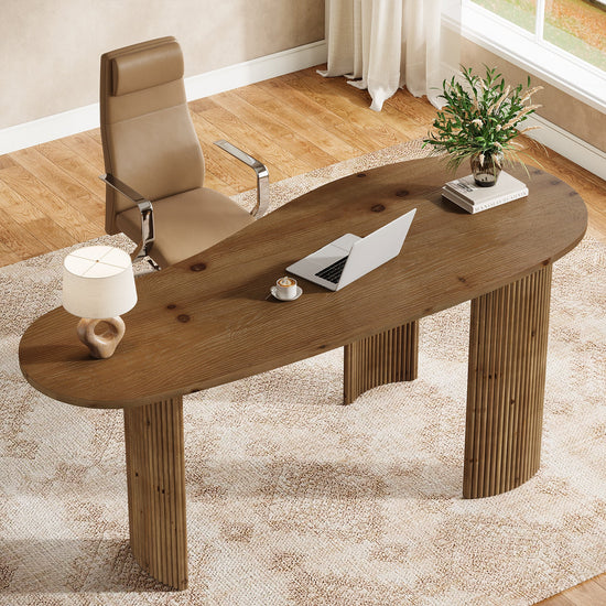 59" Solid Wood Executive Desk, Curved Computer Desk with Fluted Wooden Legs