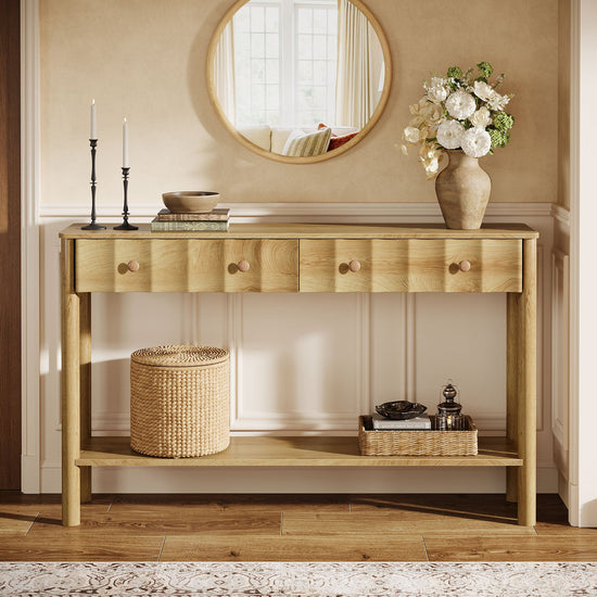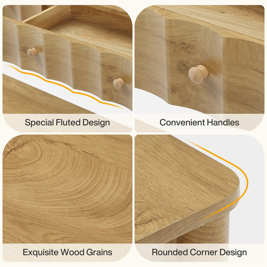 Charming Elegance - Unveil the cozy charm of our console table styled with warm, light oak veneer and a delicate wood grain. The modern fluted design of the drawers blend seamlessly with the farmhouse aesthetic, imparting a visually appealing allure to your space.