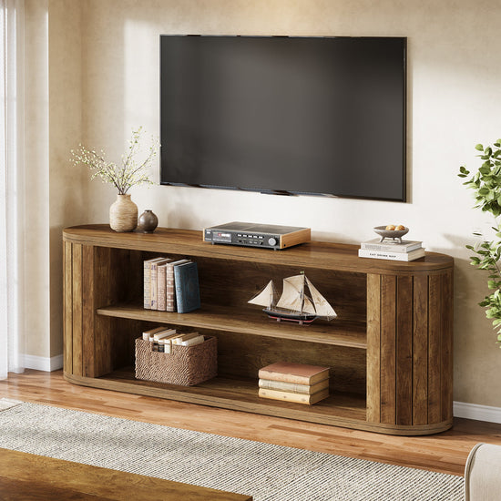 Minimalistic Yet Elegant Design - This TV stand's sleek oval tabletop and slatted legs beautifully merge modern country style with warm, natural aesthetics. Its straightforward design adds a touch of elegance without compromising simplicity.